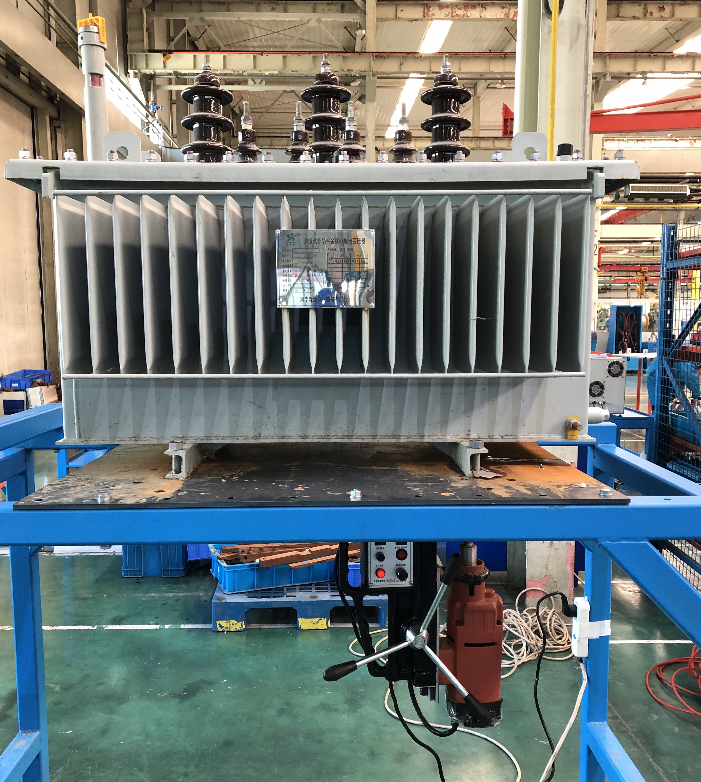 以前,当用户要求的变压器地脚孔距与备库非晶合金变压器不一致时,需要经过抽油-吊芯-拆附件后才能进行钻孔,之后还要进行重新装配-注油—抽真空-静止与试验等一系列工序,改装过程极其繁琐,不仅浪费大量人力,还影响产品交货期。针对此问题成装车间主任带领车间骨干员工集思广益、群策群力设计地脚孔拆改专用工装。该工装分为支撑架与支撑钢板两部分,在支撑钢板上可实现后续所有非晶变压器地脚孔的便捷调整,人站立在支撑架下面使用磁力钻即能进行精确的测量与孔距调整,避免了对整个变压器器身的拆改装配,在降低了员工劳动强度与工作量的同时,还缩短了产品交货期。