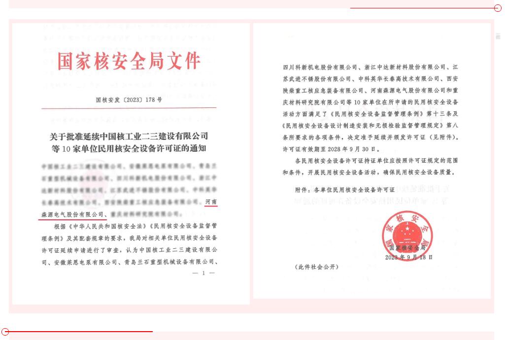 近日,国家核安全局(国核安发〔2023〕178号)批准河南森源电气股份有限公司等10家单位“民用核安全设备设计和制造许可证”延续申请。