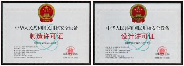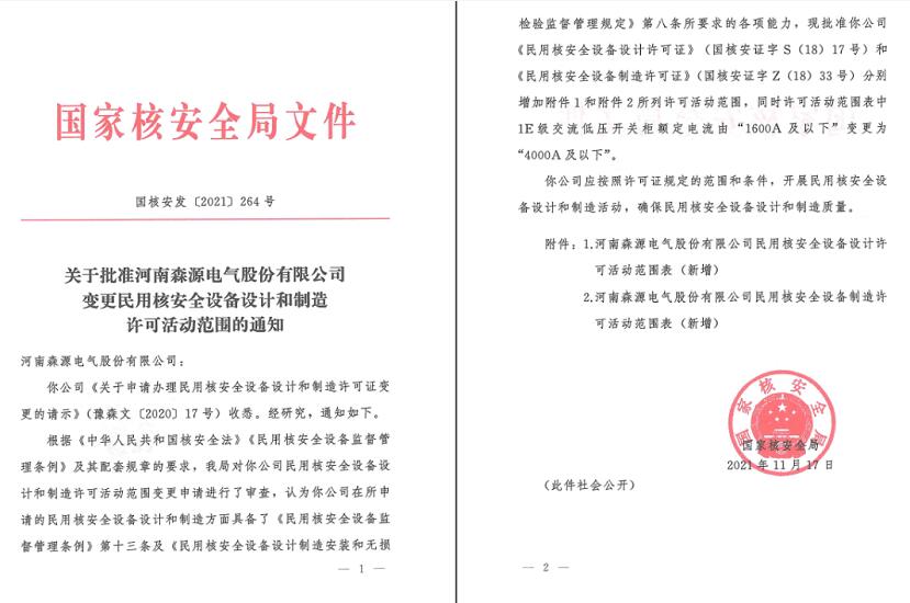 2016年,森源研制了ap1000、cap1000、cap1400核电站用1e级主泵断路器柜和停堆断路器柜,通过取证申请、质保体系建立、模拟件制作、鉴定试验和审查,2018年10月国家核安全局下发了《关于颁发河南森源电气股份有限公司民用核安全设备设计和制造许可证的通知》,森源获得了由国家核安全局颁发的《民用核安全设备设计许可证》(国核安证字s(18)17号)和《民用核安全设备制造许可证》(国核安证字z(18)33号)。