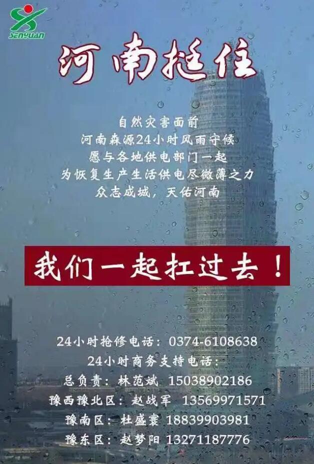 在暴雨灾害发生后,公司就积极与河南电网各地市公司、郑州铁路局以及地铁公司主动联系沟通,是否需要森源电气配合抢修设备等系列工作。后续森源电气公司将积极持续提供最优服务,为抢险救灾,保障人民生活贡献森源力量。