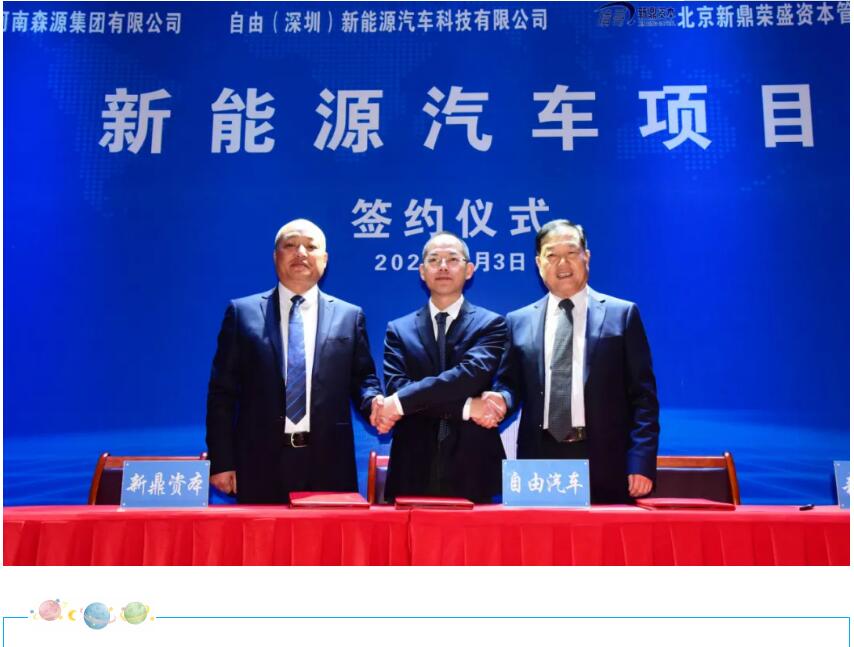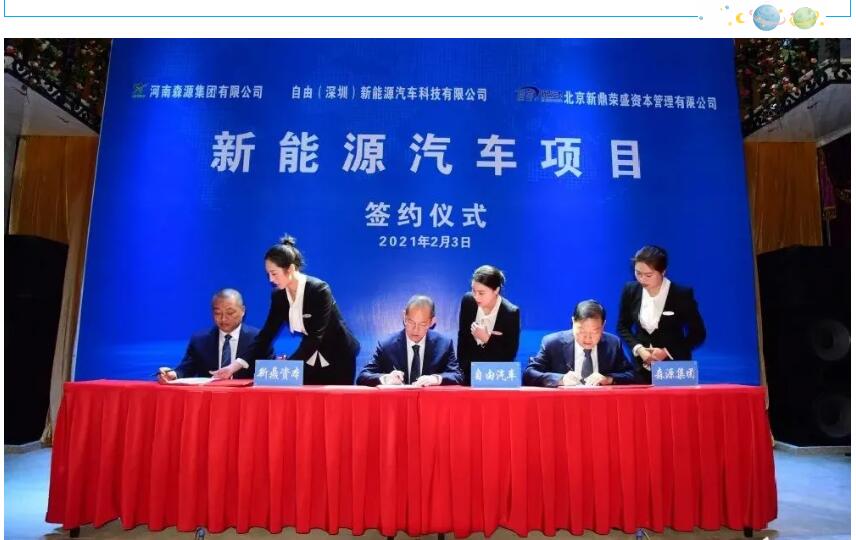 国家《新能源汽车产业发展规划(2021-2035年)》的发布实施,为新能源汽车产业发展提供了广阔的发展空间。“十四五”期间新能源汽车市场将进入“市场 政策”的双轮驱动新阶段。为此,河南森源集团有限公司、自由(深圳)新能源汽车科技有限公司、北京新鼎荣盛资本管理有限公司就新能源汽车项目,于2021年2月3日 签署正式合作协议