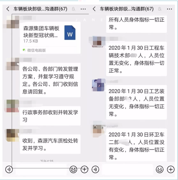 1月23日,森源集团立即成立疫情防控专项工作领导小组,研究制定了疫情防控具体措施,并下发通知,以各板块各部门为单位,每日进行职工位置动态信息及职工身体状况统计上报,同时加大疫情防控知识宣传力度。