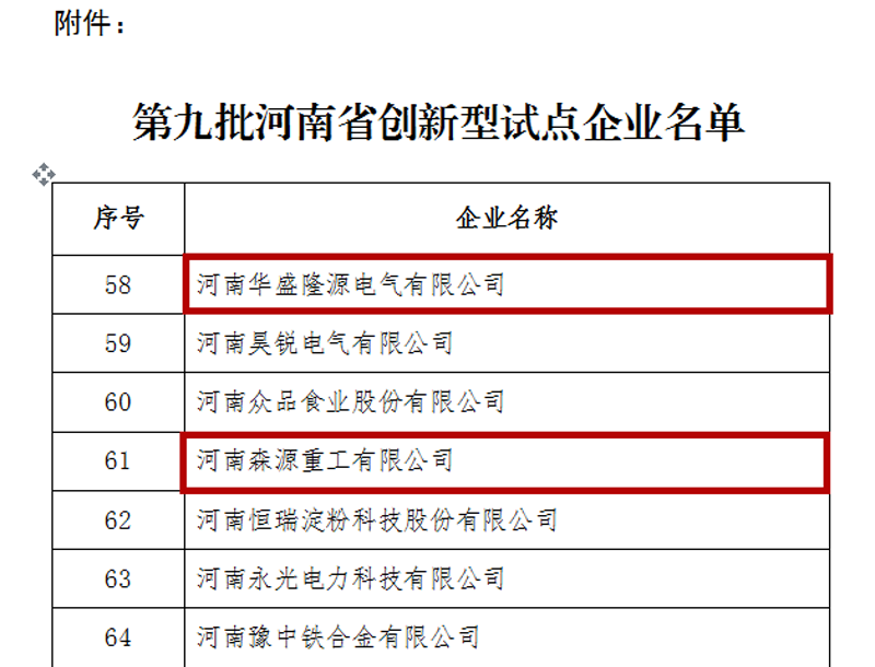 5月26日,河南省科学技术厅发布公告,经评审,河南森源集团有限公司旗下河南森源重工有限公司、河南华盛隆源电气有限公司等企业被确定为河南省创新型试点企业。