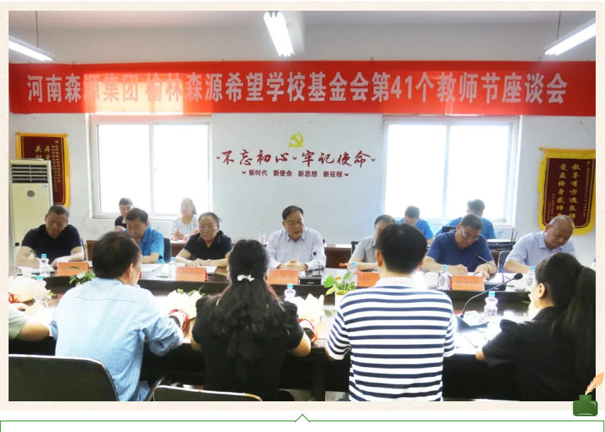 9月10日,在第41个教师节到来之际,河南森源集团、榆林森源希望学校基金会举行教师节座谈会,森源集团党委书记、基金会理事长楚金甫,森源集团常务副总裁、基金会副理事长杨合岭,河南森源电气股份有限公司董事长、基金会理事赵中亭,后河镇党委政府、后河镇中心学校、基金会及榆林村委相关领导出席座谈会。