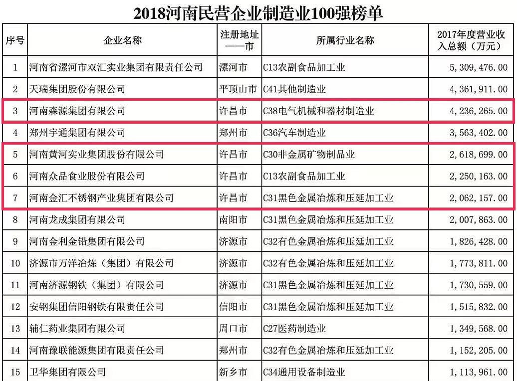 2018“河南民营企业制造业100强”榜单中,森源集团、黄河集团、众品食业、金汇集团和金阳铝业分别排在第3名、第5名、第6名、第7名及第39名。