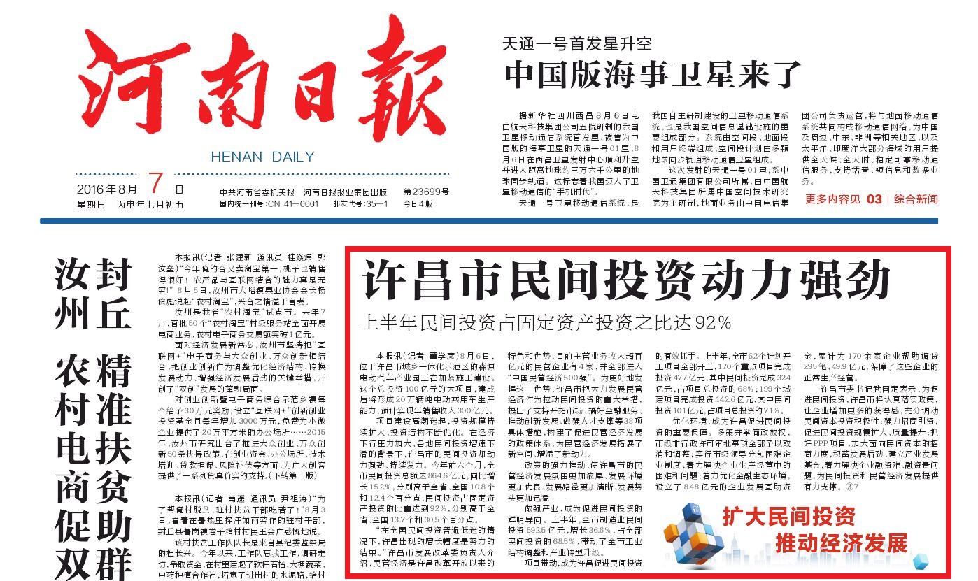 8月7日,《河南日报》在头版《许昌市民间投资动力强劲》一文中提到在经济下行压力加大、各地民间投资增速下滑的背景下,以森源集团为典型代表的许昌市的民间投资,却动力强劲、持续发力。
