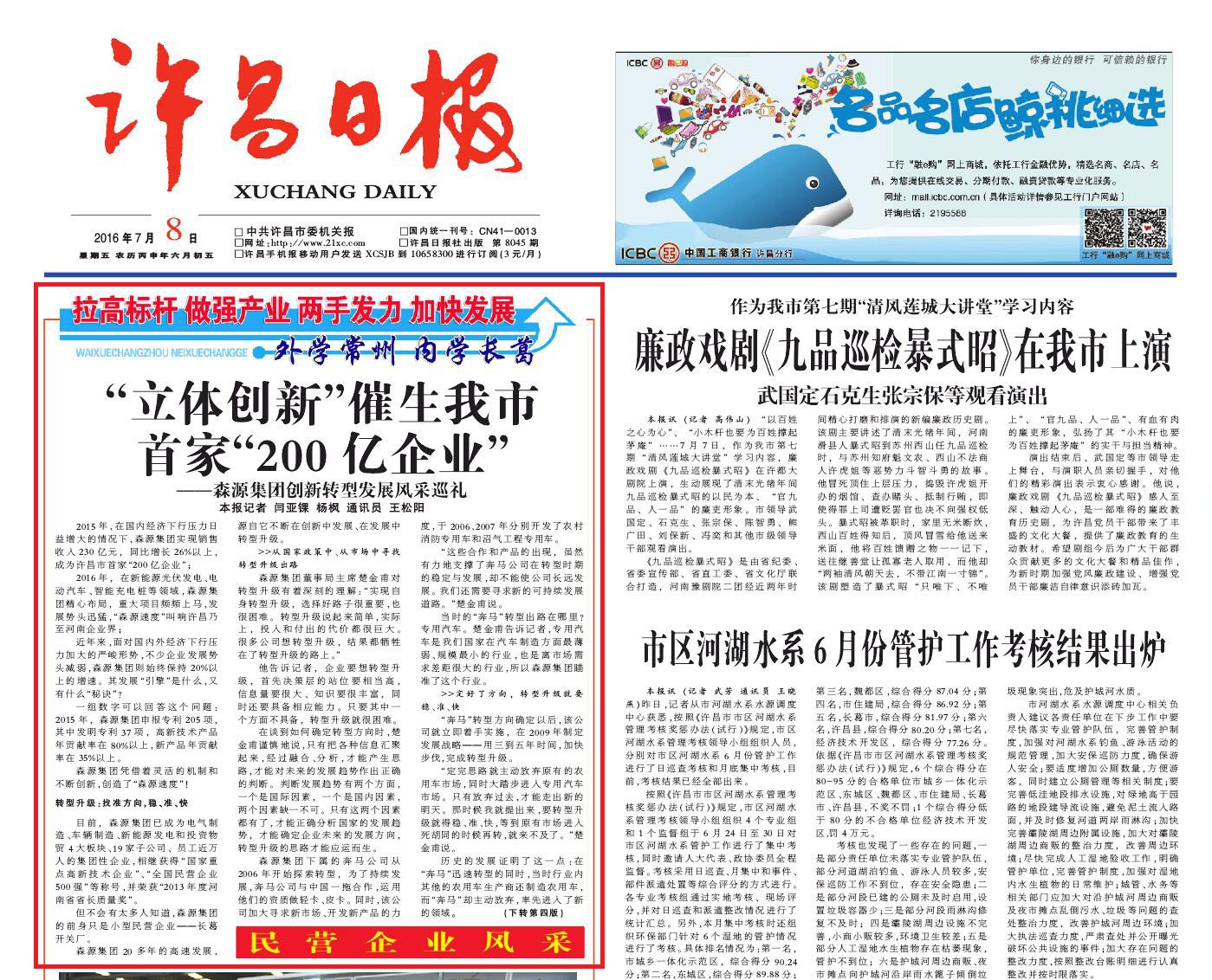 2015年,在国内经济下行压力日益增大的情况下,森源集团实现销售收入230亿元,同比增长26%以上,成为许昌市首家“200亿企业”;